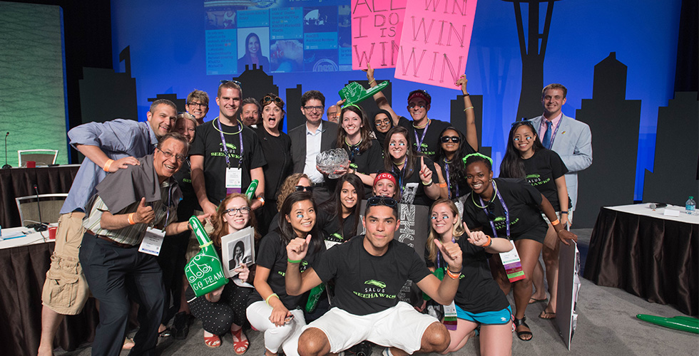 The always well-attended and much anticipated Varilux Student Bowl is one of the highlights of the AOA conference, with students from each school dressed in specially-designed T-shirts displaying their team names and carrying noisemakers and posters in support of their school’s representative. Salus PCO students – the Seattle Seehawks – did a great job of supporting Nicole, who was awarded a $1,000 prize by Essilor/Varilux and will have her name engraved on the crystal trophy, which hasn’t been in Elkins Park since the 2011 victory of Ian McWherter, OD '12.