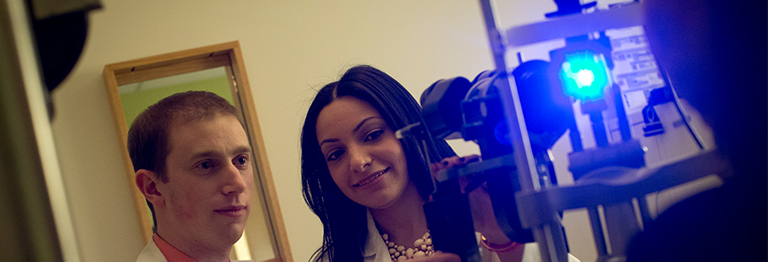 Labs are also accelerated—students in the Scholars Program have four hours a week for six months instead of two hours a week for a year. These students then complete four externships in a single year: one at The Eye Institute, one at a Veterans Affairs or Indian Health Services facility, one at a contact lens site, and one with a pediatric emphasis.