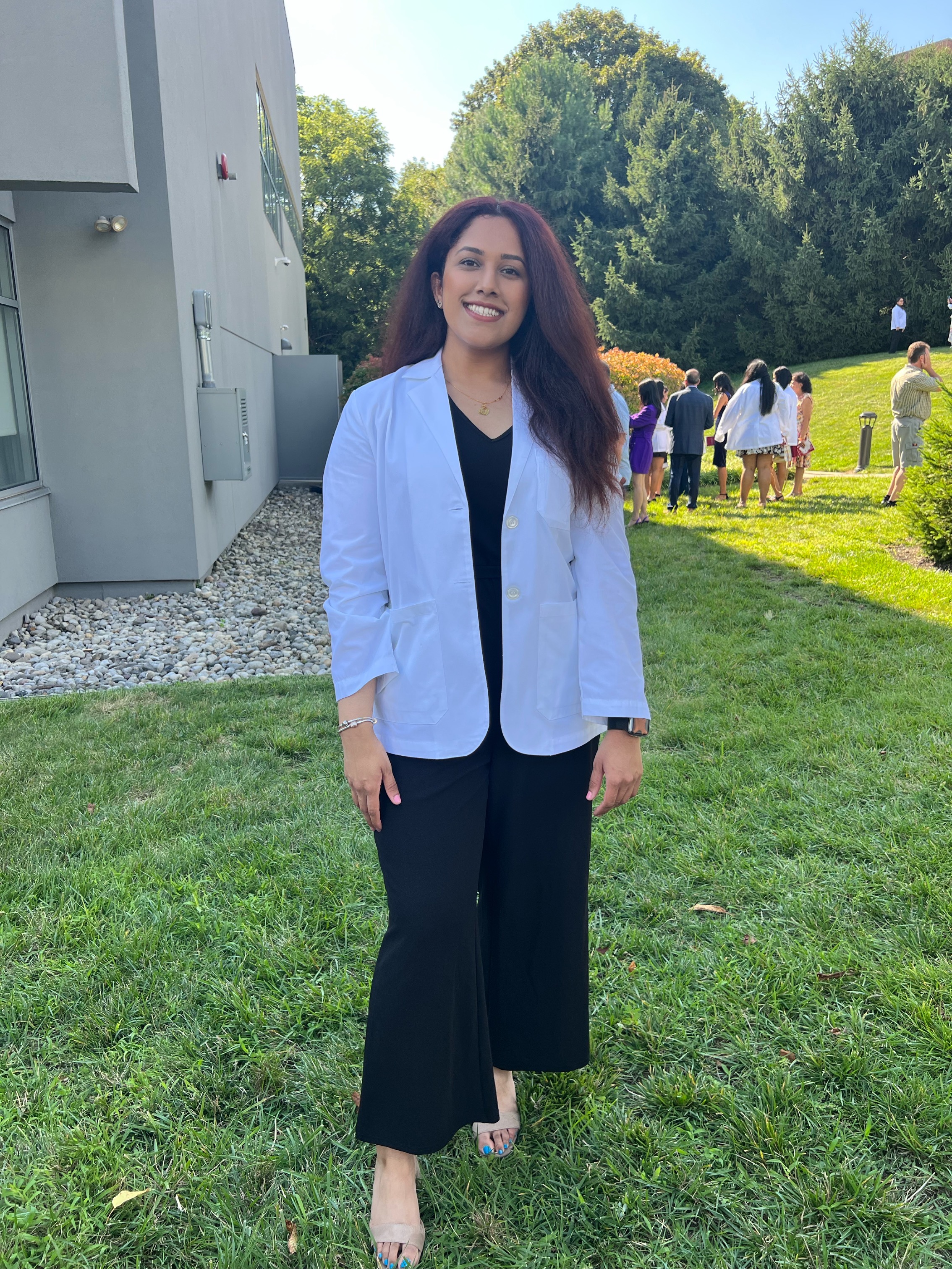 Each day is a little different, packed with labs, lectures, and patient care. Typically, I wake up at 7 a.m. if I have an 8 a.m. class to get ready for the day. I don’t usually eat breakfast but grab a protein shake or snack to go. Classes generally run from 8 a.m. to 5 p.m., but on some days, I finish earlier and head home by 3 p.m. to watch recorded lectures (Panoptos) in the comfort of my home, often accompanied by my cat. When I stay on campus all day, I either bring lunch from home (if I had time to prepare it the day before) or grab something from the café.
